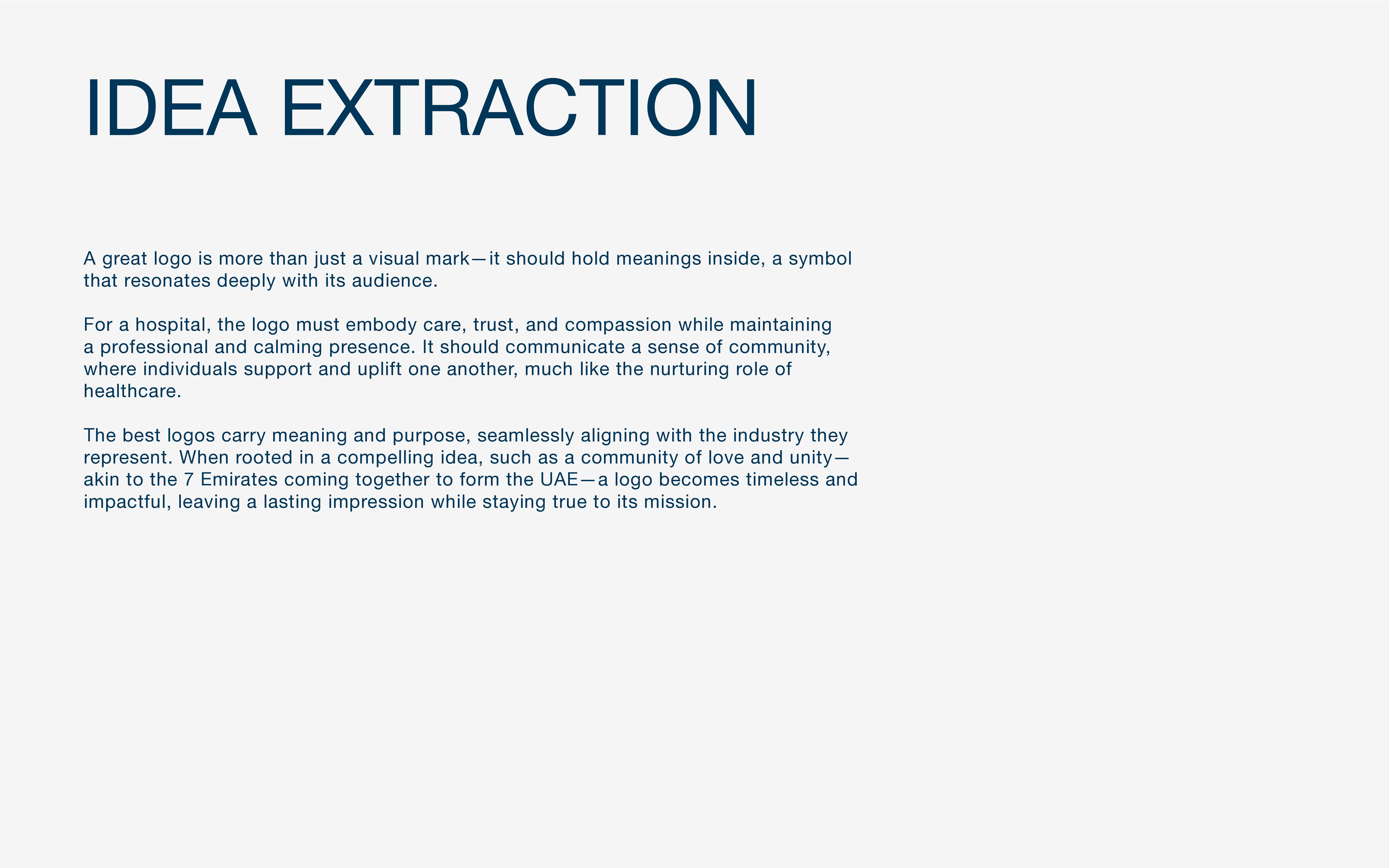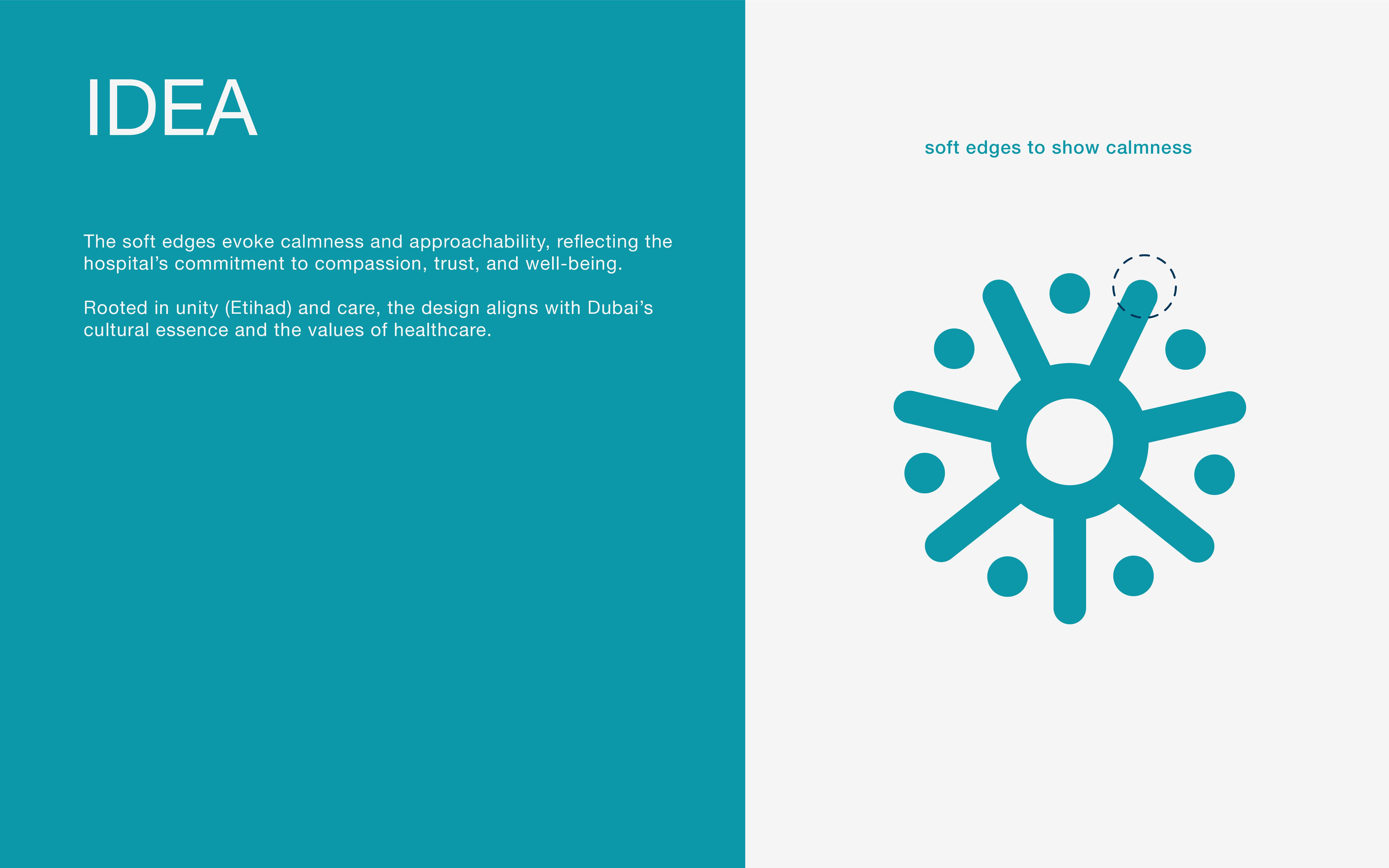 The soft edges of the logo evoke calmness, ensuring that the hospital's identity is approachable and reassuring, aligning with its mission to provide a warm, welcoming environment for patients. The design also incorporates symbolic references to the 7 Emirates to express unity, reinforcing the cultural values of Dubai and the UAE.