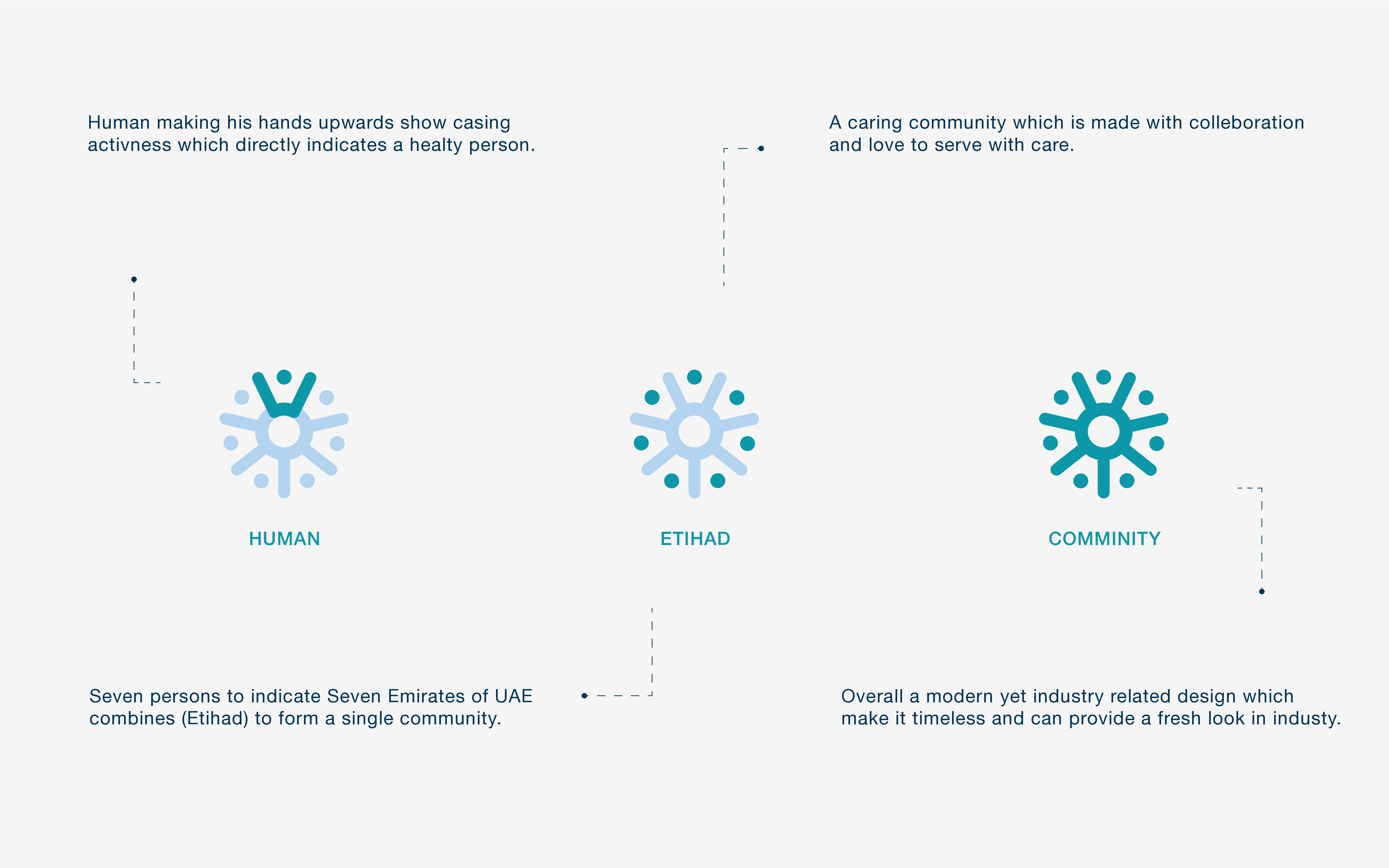 The Etihad Hospital logo design represents more than just a visual mark; it is a symbol of care, compassion, trust, and community. The logo draws inspiration from the concept of unity, much like the 7 Emirates coming together to form the UAE, creating a sense of belonging and support. The design features a stylized human figure with open arms, reflecting a healthy, active person, while the surrounding circular motif symbolizes the interconnectedness and nurturing qualities of healthcare.