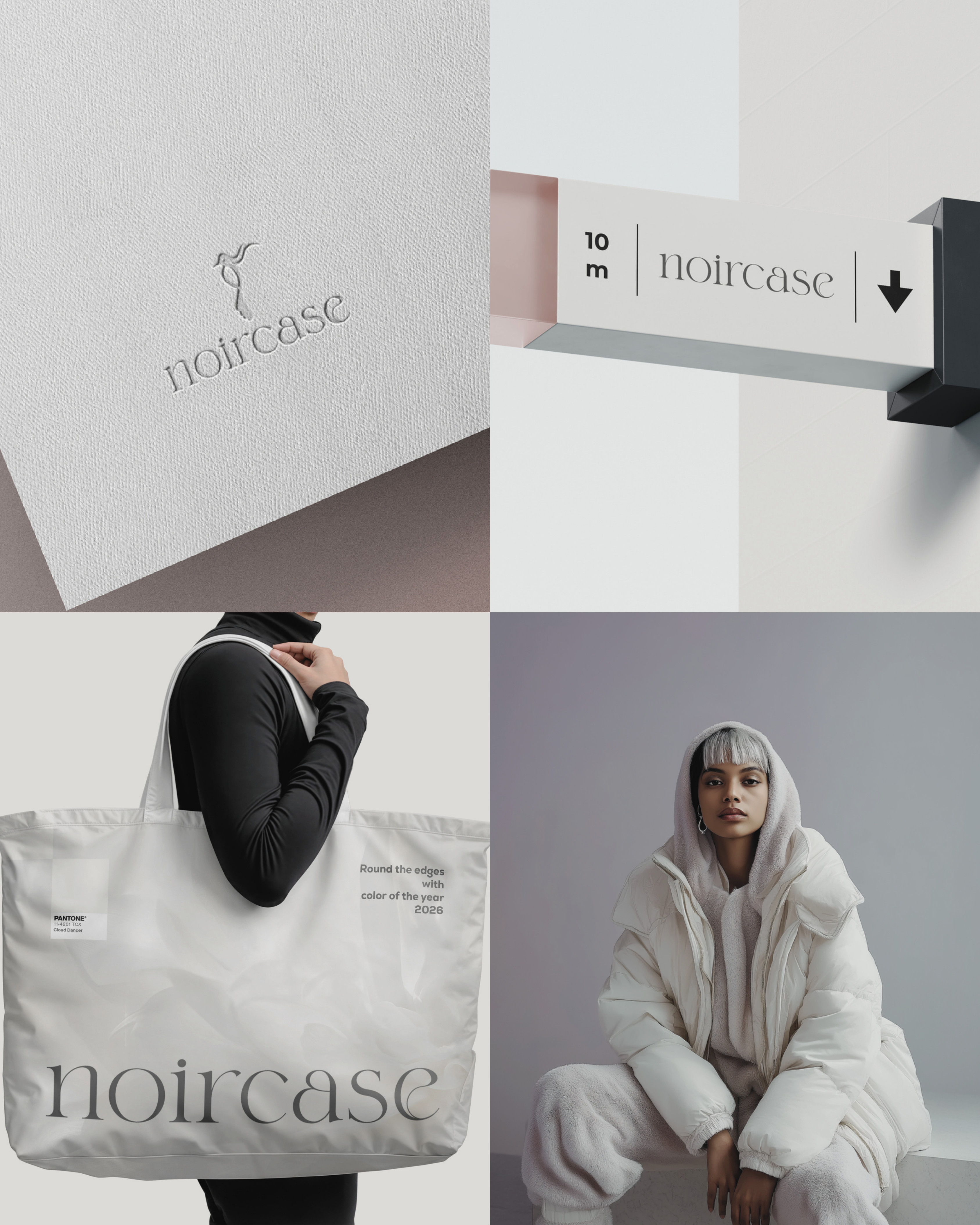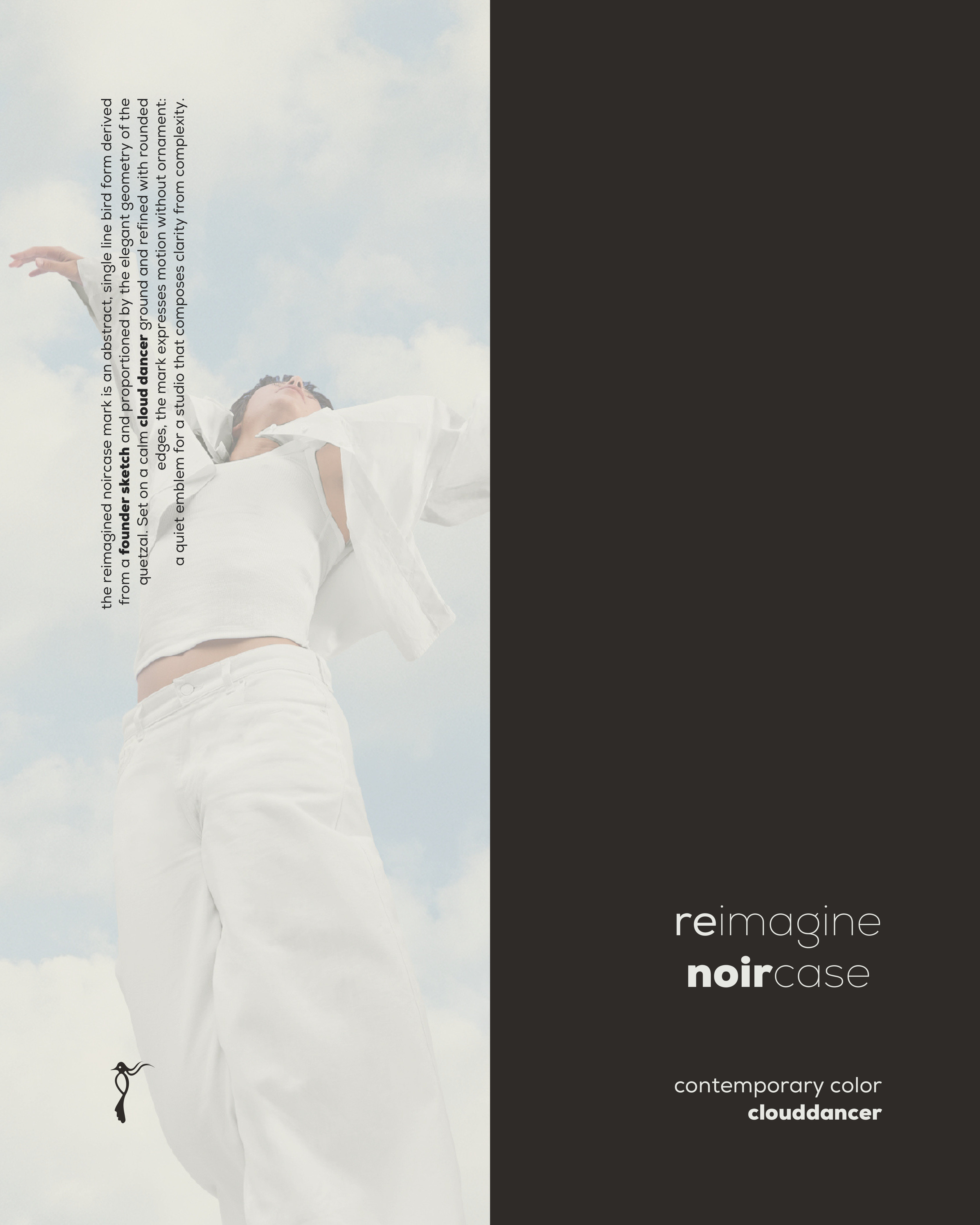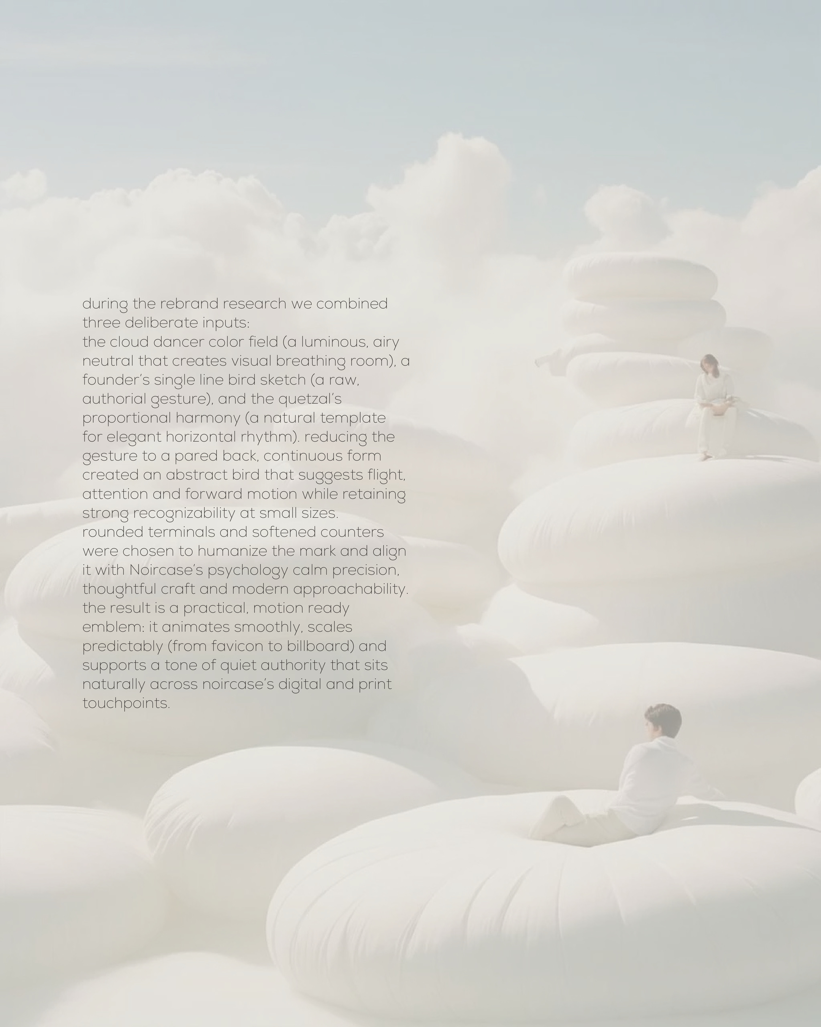 The Noircase Reimagine project embodies a perfect fusion of soft sophistication and sharp precision. Inspired by the serene neutral hues of Cloud Dancer, the rebranded logo features a refined, abstract bird shape symbolizing motion and clarity. This rebranding represents a commitment to quality and design excellence, prioritizing simplicity, elegance, and human-centered design.